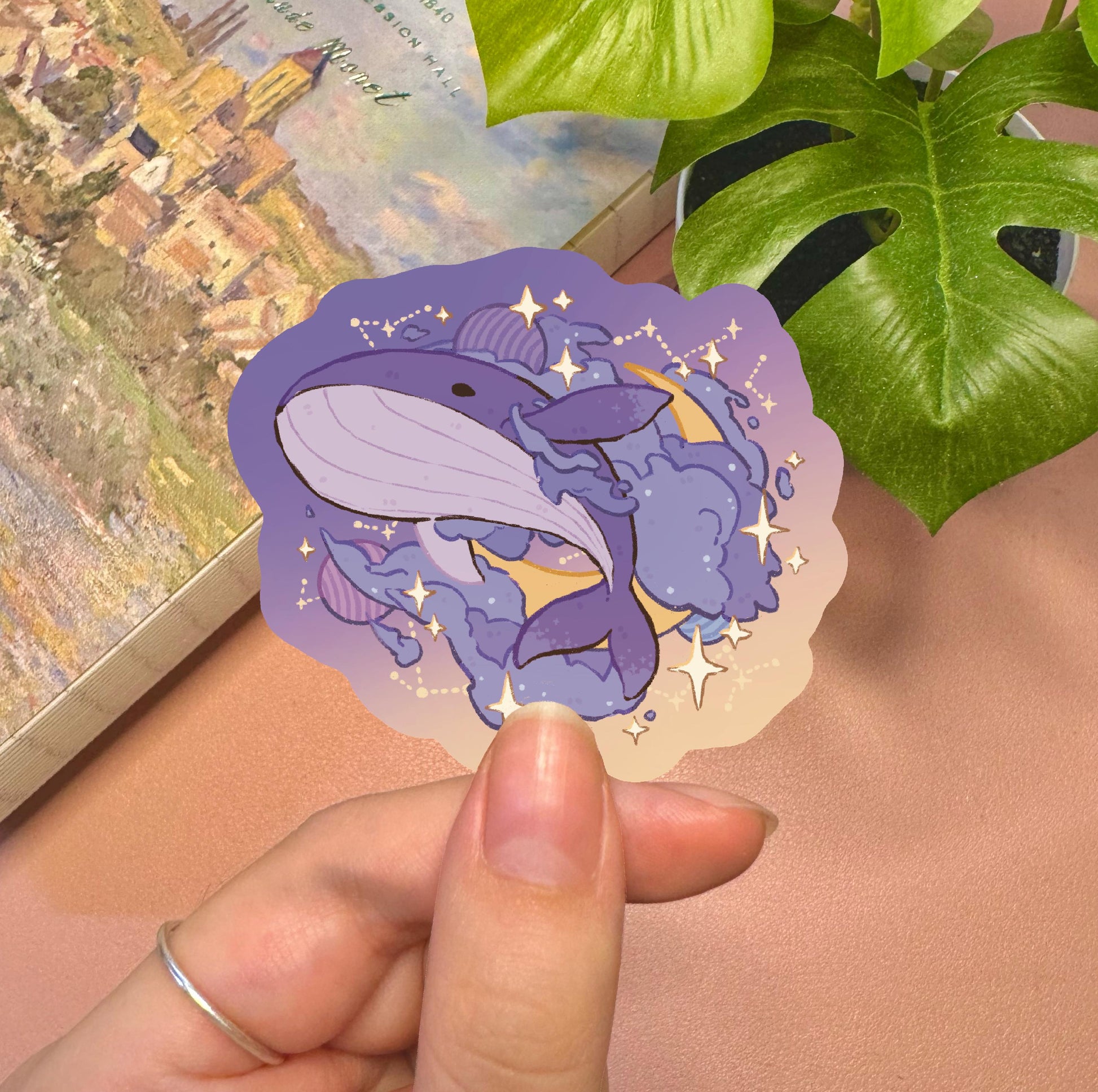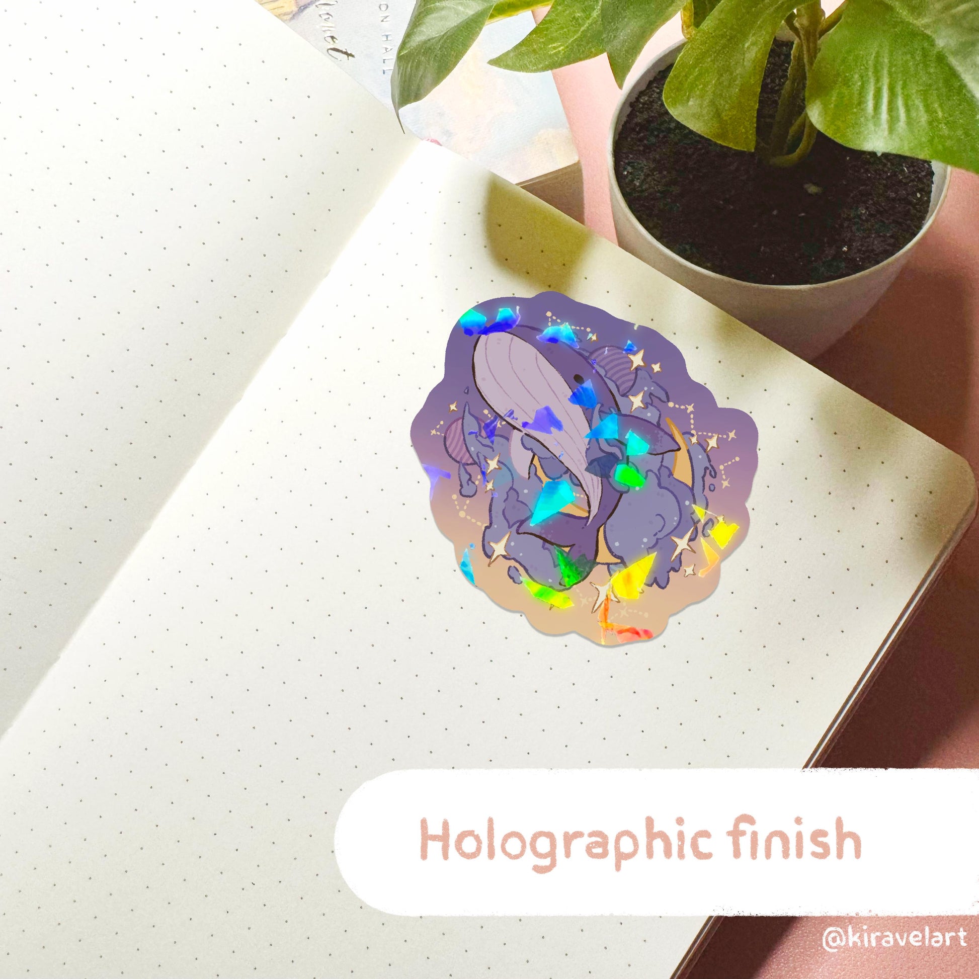 Cute galaxy whale sticker. The stickers are about 3 inches each. There are 2 different finishes. All 2 finishes are waterproof. Both the glossy and holographic are also scratch and UV proof, making it the best for laptops, water bottles, phone cases or any exposed surface.