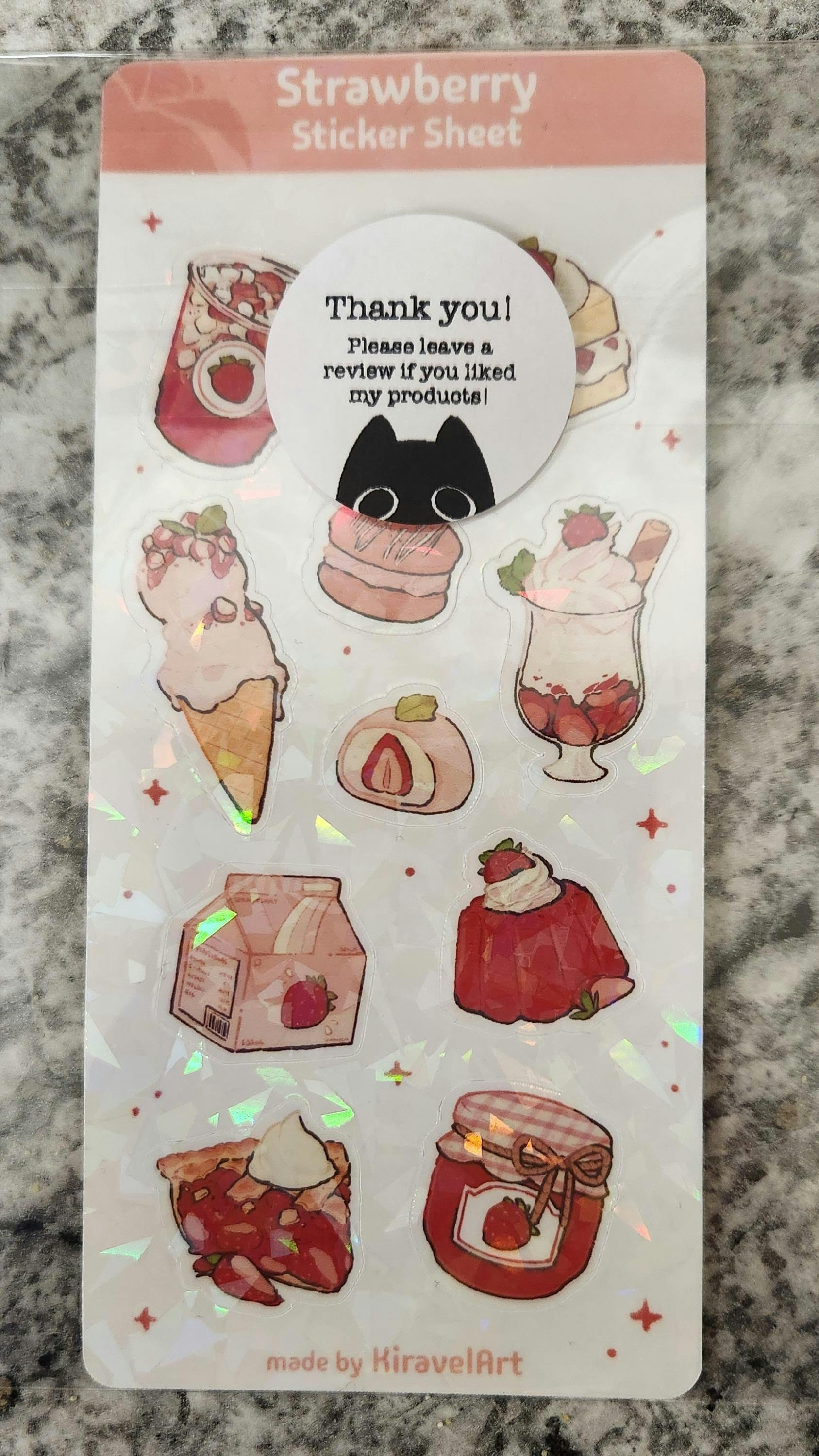 Perfect little strawberry themed stickers! Colours are nice, they arrived quick, and got to love the holographic sparkles. <3